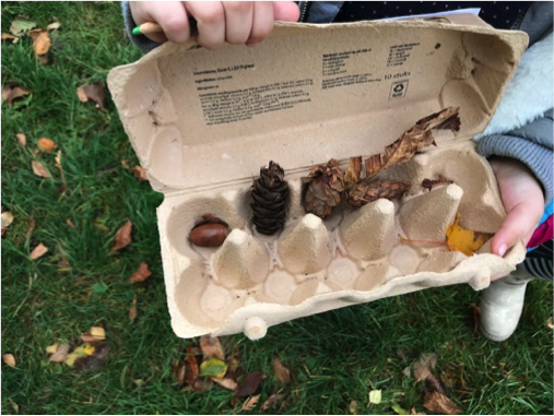 Deze voorwerpen moesten ze gaan zoeken. Maar ook moesten ze er voorzichtig mee zijn, welke eikels kan je pakken? Moet je alles pakken? Waarom wel of niet? Wie eten er eikels?